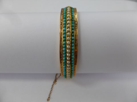 A Lady's 14 Ct Rose Gold Edwardian Seed Pearl and Turquoise Bracelet. 72 turquoise, 25 seed pearls, in original blue leather presentation box.