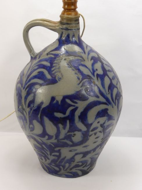 A Generously Proportioned Stoneware Westerwald,Blue Glazed Flask, converted into a lamp base, the flask depicting a foliate design with galloping horses, approx 50 cms high, excludes lamp fitting.