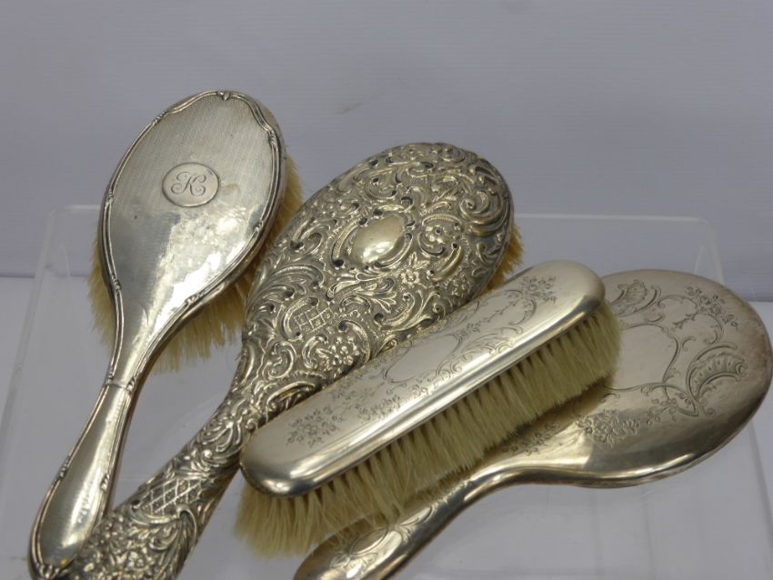 A Silver Dressing Table Set, London hallmark, mirror and clothes brush, together with a hair brush Birmingham hallmark and a silver plated hair brush.