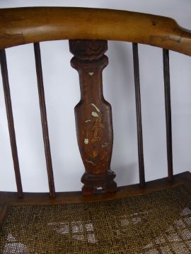 A Japanese Fruit Wood Spindle Back X Frame Chair, the chair having ivory inlaid character to back panel.