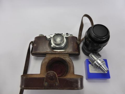 An Antique Vintage Leica 338239 Camera, with Ernst Leitz 1:2 f=5 cms lens together with a Leica continuous variable view finder 135-34 mm., together with long focus Visio-flex lens.