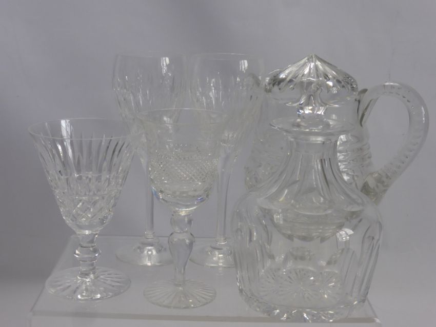 A Miscellaneous Collection of Cut Glass, including wine glasses, water jug and three decanters.