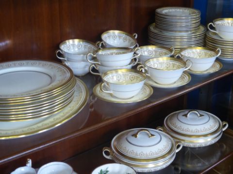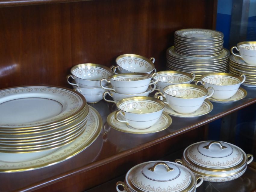 A Fine Bone China 'Aynsley' Dinner Service, comprising two lidded serving dishes, oval meat plate, eleven soup bowls and saucers, gravy boat and saucer, nine dinner plates, twelve fish plates.