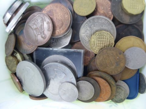 A Miscellaneous Collection of GB Coins, including crowns, copper, sixpences, together with two 1887 silver and enamel crown pin brooches and a one ounce proof 1992 American Eagle dollar in original box.