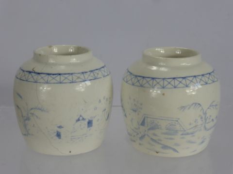 Two of 18th Century English Blue and White Ginger Jars, hand painted oriental design, the jars having blurred finish and depict stylized oriental scenes, possibly Lund's Bristol or early Worcester, approx 10 cms (af) Provenance: Bought by the Vendors Grandfather in the 1950's whilst accompanied on a London buying spree by famous broadcaster and antiques expert Arthur Neagus OBE (1903-1985)