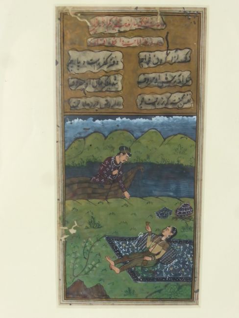 An Antique Painting, depicting a young couple enjoying a picnic, approx 18 x 8 cms, possibly Kashmiri.