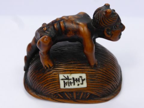 Edo/Meiji Period Japanese Netsuke, intricately carved box wood netsuke depicting an Oni trapping his immortal enemy Shoki, the demon queller under a basket, when the netsuke is turned over Shok is revealed entrapped. Ivory signature seal Houkei, approx 3 x 4 cms Provenance: From a private collection belonging to the Late Dermott Levins, avid Oriental collector, Levins bought from notable London galleries and auction houses in the mid-1940's including Glendining & Co New Bond Street, Yamanaka & Co New Bond Street and later Sothebys.