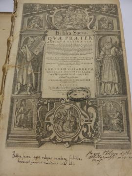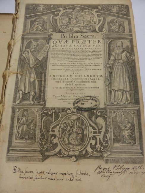 A 16th Century German published (Francofurti) Latin Biblia Sacra Osiandri Bible, original cream vellum cover.