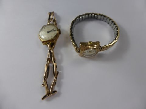 A Lady's 9 ct Gold Cocktail Watch, on 9 ct gold elastic bracelet, together with 9 ct gold Excalibur lady's cocktail watch, wt of watches without movement approx 10.5 gms.
