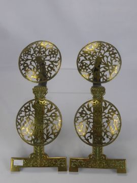 A Pair of Regency Brass Fire Dog Fronts, the fronts of a pierced floral shield design, approx 56 x 21 cms.