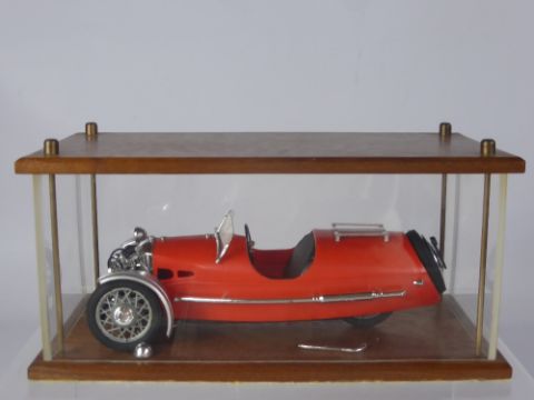 A Bentley Replica Model 3 Wheeler, together with a Rolls Royce Silver Ghost replica car and a bicycle, presented in a perspex case. (3)