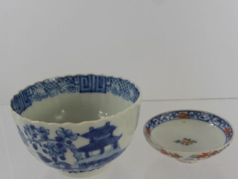 An Antique Chinese Brush Wash, with character marks to base, hand painted with floral design together with an antique blue and white tea bowl, hand painted with a view of a private estate, fluted rim. (2)