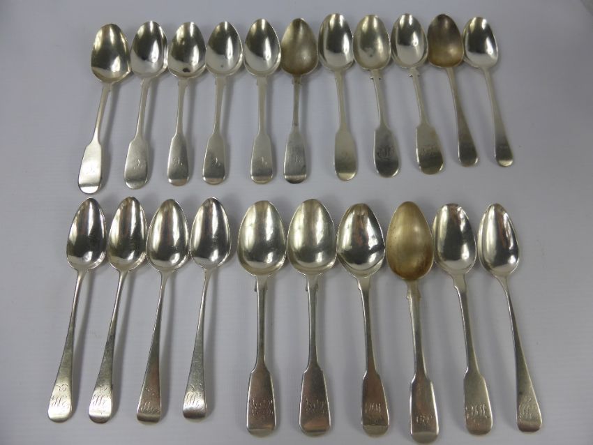 Fourteen Miscellaneous 19th Century Teaspoons, various hallmarks, London and Exeter amongst them, approx 390 gms.