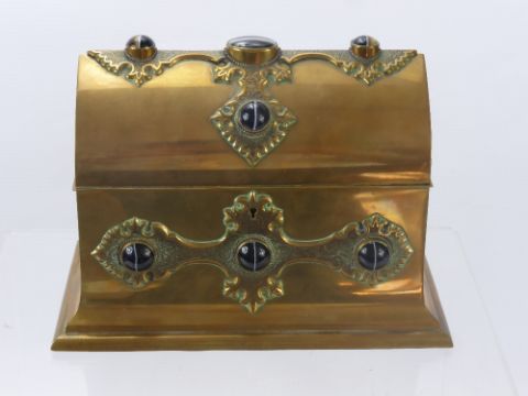 A Victorian Brass Domed Letter Box, of ecclesiastical design, the hinged lid with ornate brass fittings and eight raised onyx medallions, the interior has three separate compartments with burgundy leather trim, approx 19 x 17 cms.
