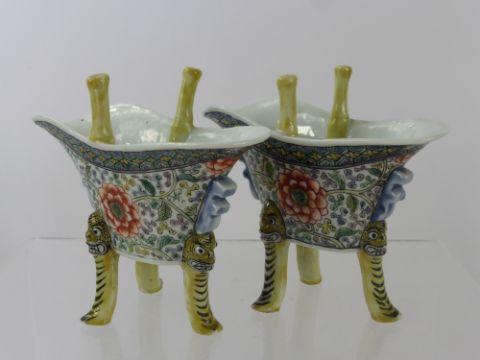 A Pair of Antique Chinese Famille Vert Libation Cups, the cup being ovoid in design with hand painted floral decoration, the bowls supported on three splayed Kyalin mask feet, approx 14 x 13 cms.