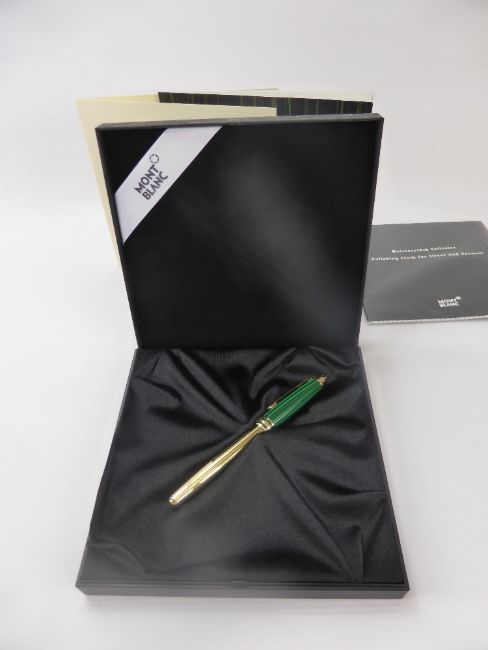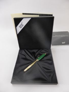 A Mont Blanc "Meisterstuck" Czar Nikolai I Malachite Ink Pen. The pen having a malachite top with solid silver 925 hallmark gold plated body, together with original signed certificate and polythene cloth, model nr 22144, all in original box.