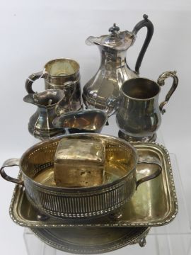 A Quantity of Silver Plate, including coffee pot, milk jug, sauce boat, pint mug, tankard, circular tray, serving dishes (circular and rectangular).