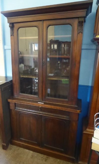 An Antique Mahogany Glazed Front Book Case, with three internal shelves, a candle drawer with two cupboards beneath, approx 105 x 39 x 200 cms.