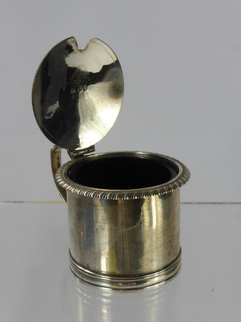 A Victorian Silver Mustard Pot, hinged lid with thumb piece, engine turned lid with roped edge decoration, London hallmark, dated 1843/44, mm rubbed, approx 126 gms (without liner).