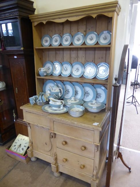 An Antique Pine Farmhouse Dresser, two cutlery drawers with cupboards beneath, two further short drawers with display rack above, on bun feet, approx 102.5 x 53 x 201 cms.