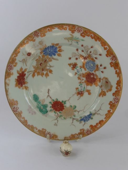 A Miniature Antique Japanese Satsuma Vase, hand painted with figures in traditional dress, approx 3 cms together with an antique Kutani Plate with character marks to base.