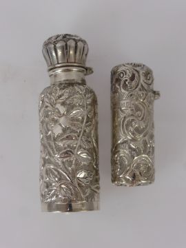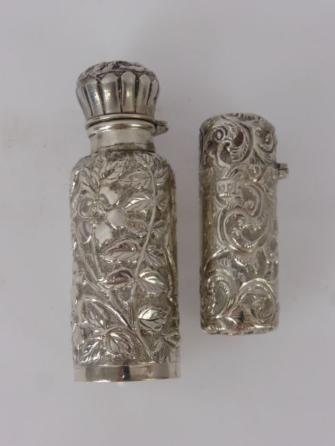 Two Hinged Victorian Silver Scent Bottles, Birmingham hallmark dated 1888 mm Arthur Willmore Pennington and another London hallmark dated 1888 mm William Stringer Mills, both bottles embossed with foliate decoration.