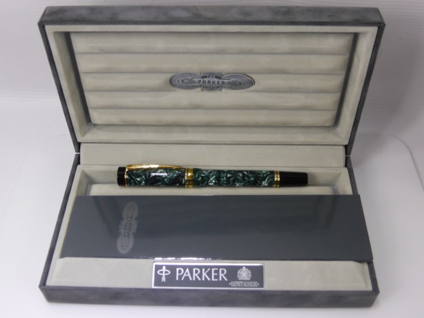A Vintage Parker Ink Pen. The green marbled pen having an 18k gold nib with original box and receipt.