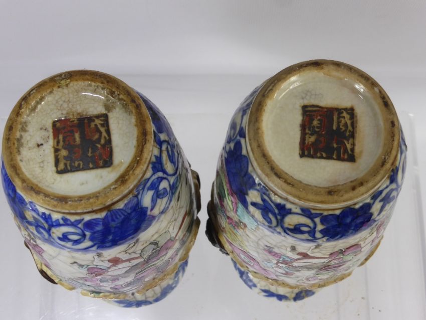 A Pair of Chinese 19th Century Crackle Glaze Vases, hand painted with famille rose enamels, depicting figures going into battle with banners and shields held aloft, approx 22 cms, Chinese seals stamped to the base of both vases (af)