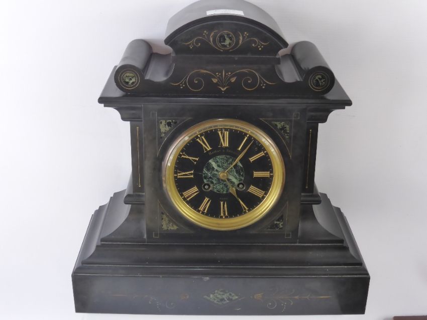 A 19th Century French Black Slate and Green Marble Mantel Clock, of architectural design, with black face with gilded Roman dial, makers mark to movement, strikes on a bell, approx 35 x 35 x 15 cms
