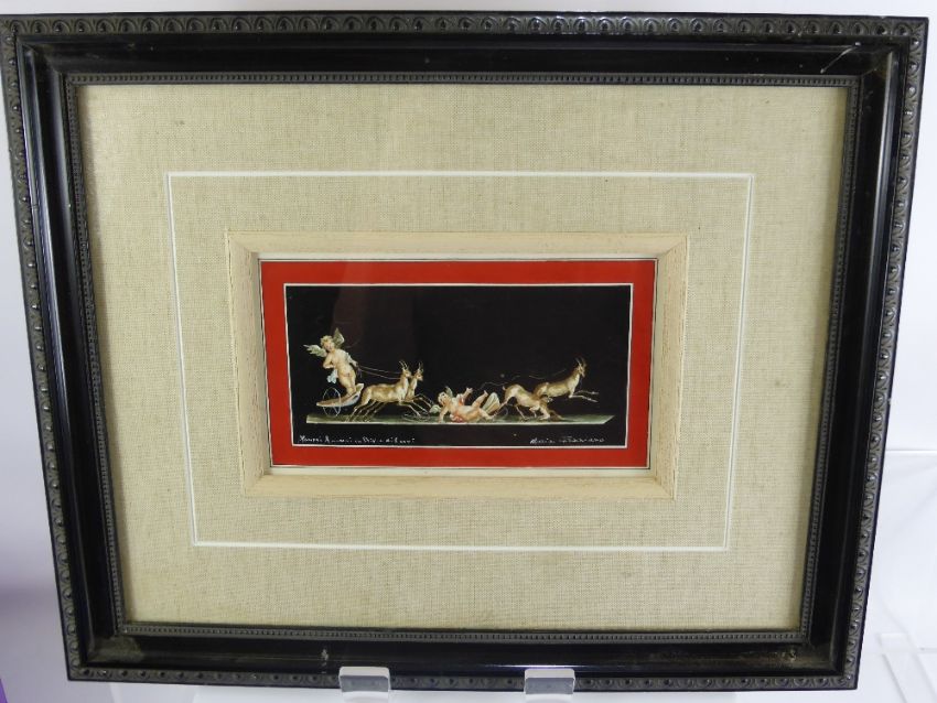 Two Antique Italian Goache Paintings, one depicting a frieze at Pompei approx 20 x 11 cms and the other of a cherub guiding dolphins, approx 25 x 13 cms, beautifully framed and glazed.