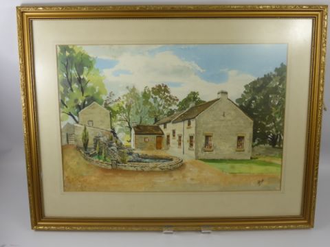 A.J. Ball, Artist, two water colour paintings depicting farm cottages approx 55 x 37 cms, framed and glazed together with an R.E. Mins water colour depicting a village square approx 35 x 24 cms.