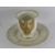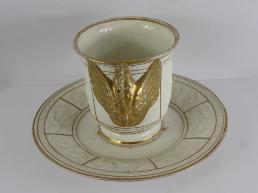 An Antique Capo di Monte Commemorative Cup and Saucer, decorated with raised classical scenes, gilded swan handle, factory marks to base, circa 1825.