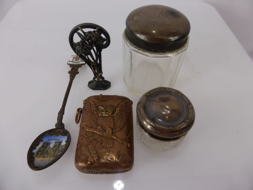 A Collection of Miscellaneous Items, including Newlyn style copper vesta case depicting an owl, the owl set with glass eyes, silver topped cut glass pill box, silver seal stamp in the form of flowers and an enamel Yorkminster spoon.