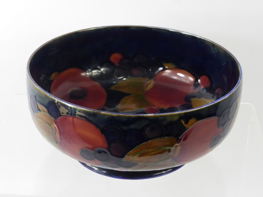 William Moorcroft 'Pomegranate' Fruit Bowl, of circular form, on green blue ground, factory marks to base, with painted initials, approx 11 x 23 cms