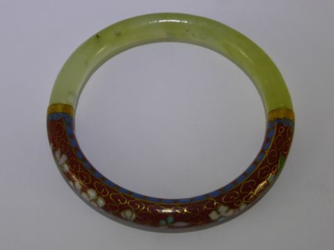 An Antique Chinese Apple Green Jade and Cloisonné Bracelet, approx 35 cms.