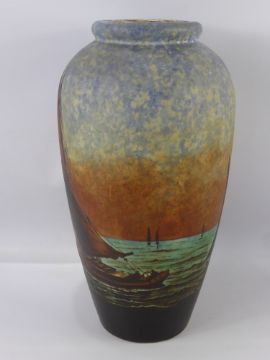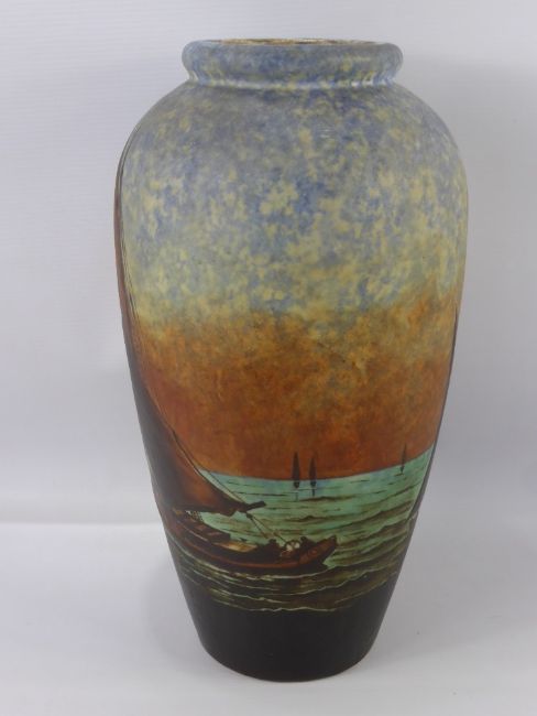 A Louis Dage Art Deco Vase, entitled "Le Pouliguen" depicting sail boats on mottled ground, approx 35 cms, signed near the base.