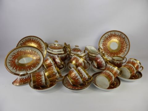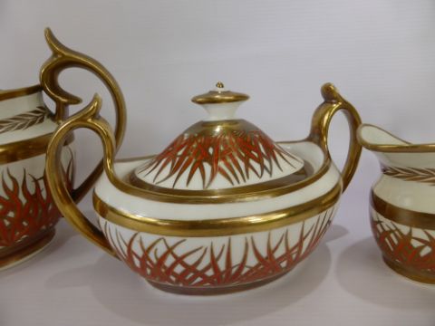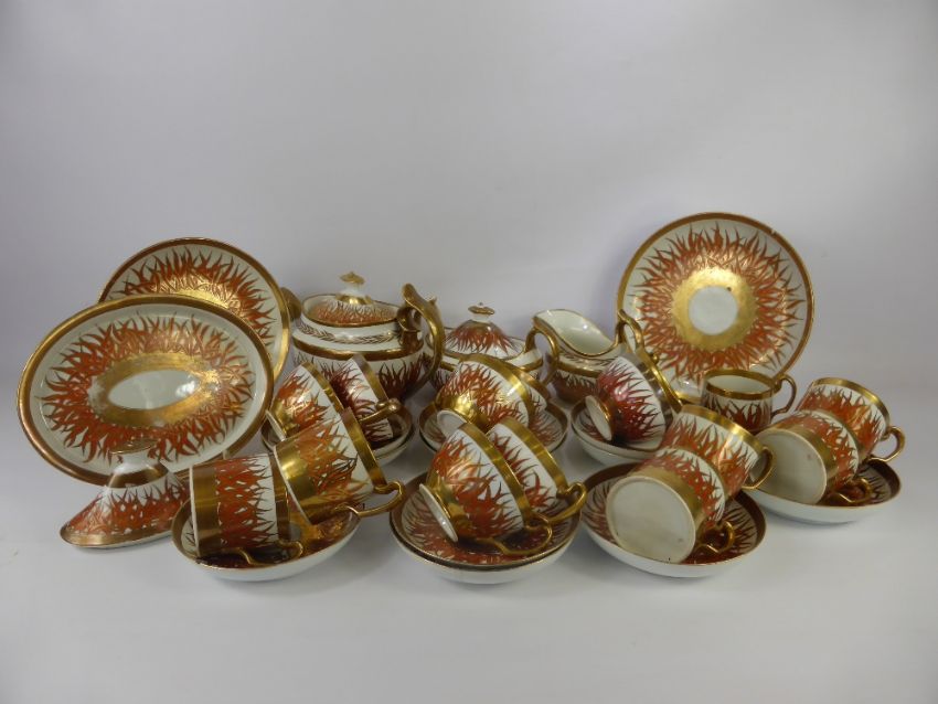 Minton First Period Part Tea and Coffee Set, circa 1805 pattern nr 180 'Nelson's Flame', comprising one tea pot and cover, one tea pot stand, sugar basin and cover, milk jug, two bread and butter plates, seven coffee cups, seven tea cups, one tea cup of a different design, eleven saucers. Provenance: In the mid-19th Century Mr Herbert Minton wrote to Mrs Boultbee of Salford Vicarage of the 'Nelson Flame' Pattern Tea Service, in the letter he confirmed that the shape was modelled in 1805 and the pattern was designed at the death of Nelson which took place on the 21st October of the same year. The set is understood to have been made for Mr Boultbee of Liverpool (father of Rev. Thomas Boultbee of Salford & Bidford) in recognition and gratitude for a money loan to help Mr Minton establish his factory. The service has remained in the Boultbee family since that time.