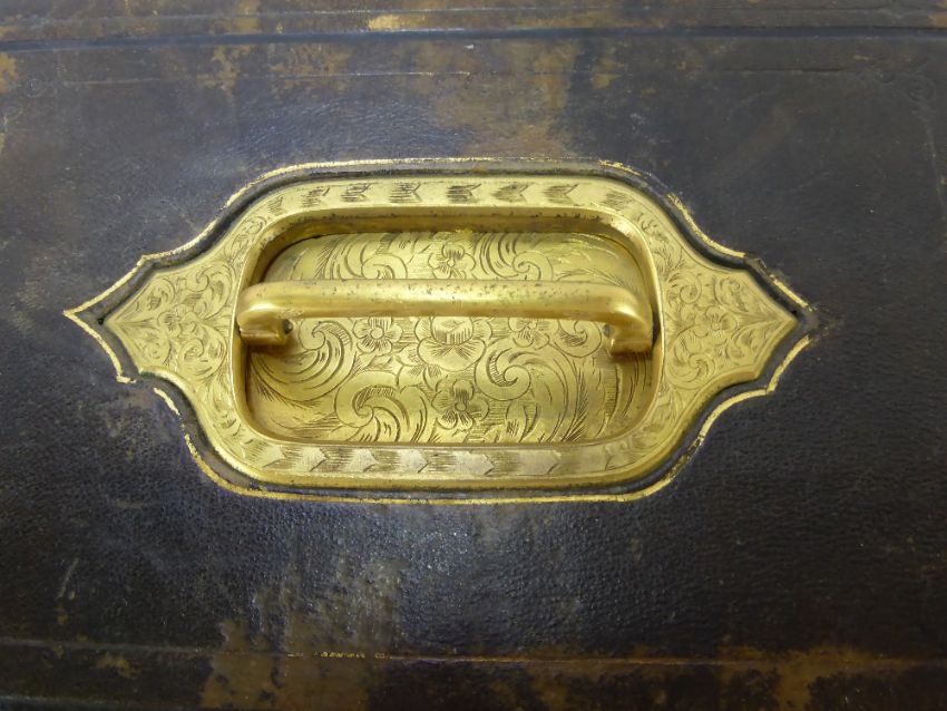 A Lady's 19th Century Leather and Gilt Brass Jewellery Box, the box with fitted blue silk and velvet interior, with gilt lock, hinges and lock plate.
