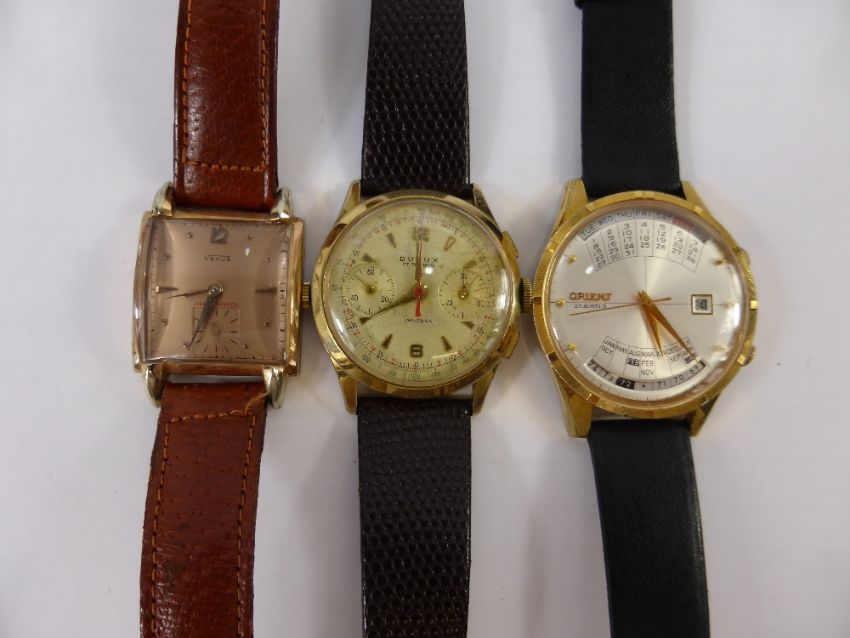 A Gentleman's Orient 21 Jewel Multi-Year Calendar Wrist Watch nr 0278509, together with a gentleman's vintage Dulux 17 Rubis Chronometer wrist watch, and a gentleman's vintage Venus wrist watch with rose gold finish face, case stamped 571003. (3)