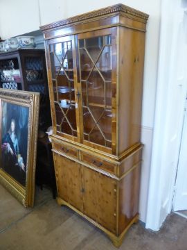 A Contemporary Yew Wood Display Cabinet, with glazed fronted doors and two internal shelves, two short drawers with cupboard beneath, raised on bracket feet, approx 90 x 195 x 40 cms.