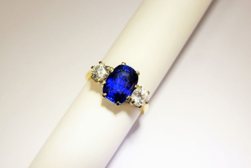 A Lady's 18 ct Yellow Gold and Platinum 3.33 cts Royal Blue Natural Non Heat Treated Ceylon Sapphire and Diamond Ring, the deep blue cushion cut sapphire measuring 9.4 x 7.0 x 5.3 mm flanked by brilliant cut diamonds on either side of approx 33 pts, size N, approx wt 5.1 gms, together with Gem and Pearl Laboratory Certificate Nr 13263 dd 7th October, 2016.