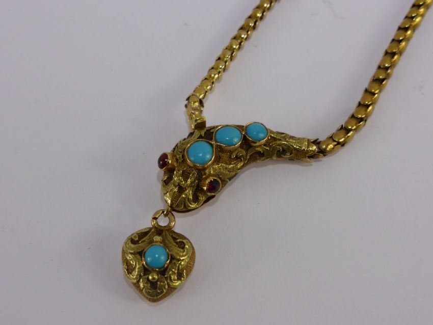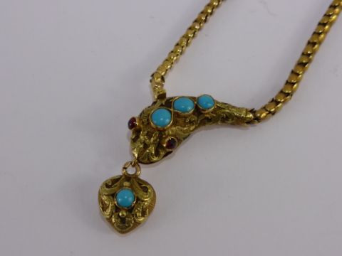 A Lady's Antique 14 ct Yellow Gold, Turquoise and Ruby Articulated Snake Necklace, the snake set with three turquoise 2 x 3 mm, 1 x 3.5 mm and 1 x 4 mm and set with two rubies cabochet eyes of 1.85 mm, the snake clutching a heart in its mouth, total approx wt 15 gms, approx 38 cms long.