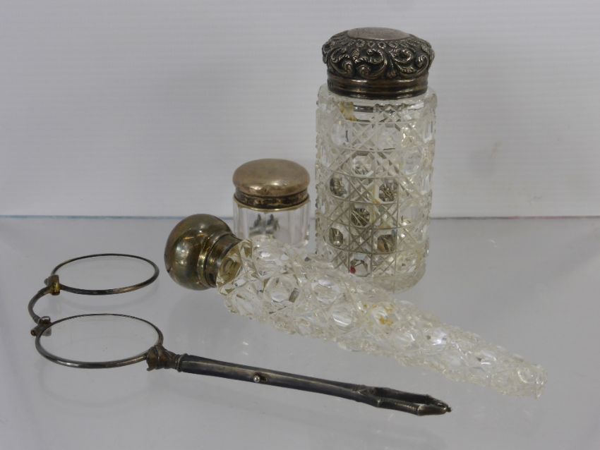 A Silver Topped Tear Form Cut Glass Perfume Bottle, marks rubbed, approx 14 cms together with a silver topped cut glass bottle and one other and a pair of silver metal sprung lunette in original leather case.
