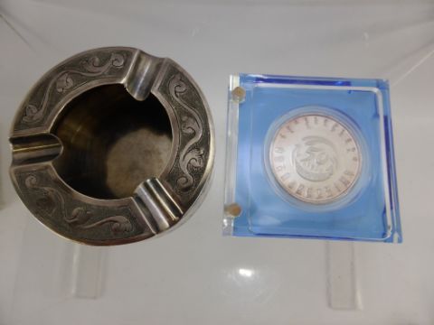 An Oriental Silver Ashtray, together with a Siamese silver coin and a Chinese silver 999 coin with certificate and original box. (3)