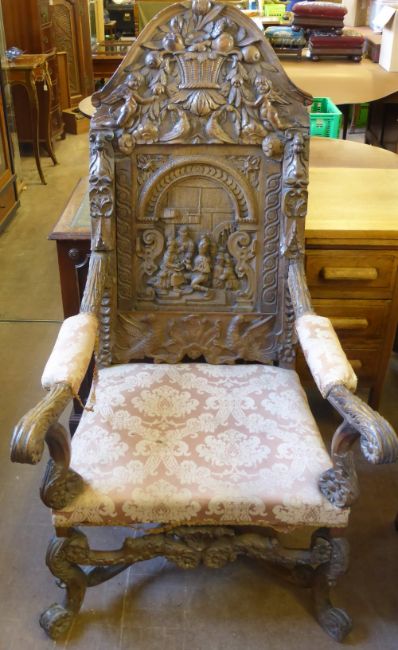 An Antique Oak Baronial Chair, the back rest with profuse decorative carving depicting a cornucopia with putti to either side, the central panel depicting a return from battle with a servant kneeling and pouring water, figural feminine carving to chair supports, swept arms with carved foliate motif, x-frame stretcher with ornate carving to legs, believed to be of Spanish origin.