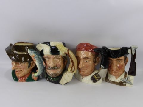 A Miscellaneous Quantity of Royal Doulton Character Jugs, including "Bootmaker" D6572, "The Poacher" D6429, "The Trapper" D6612 and "Gunsmith" D6573. (4)