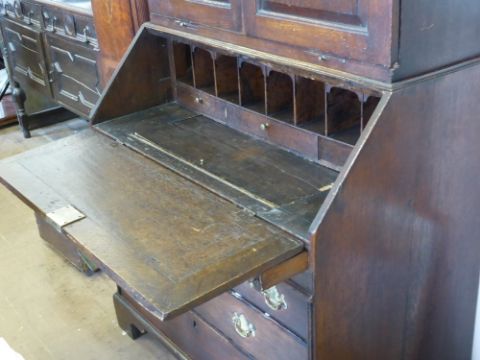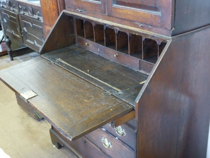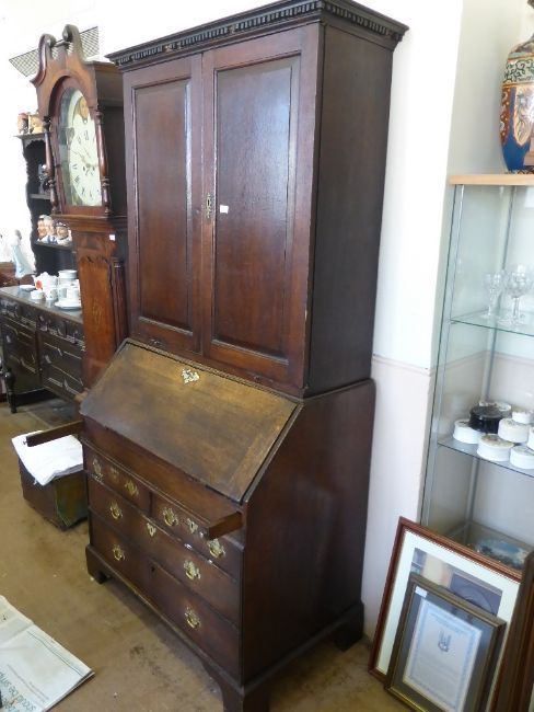 A Georgian Oak Drop Front Bureau/Book Case, the desk having two small drawers with two graduated under, the top having panelled doors with central frieze with two candle slides to base of top, approx 100 x 56 x 205 cms.