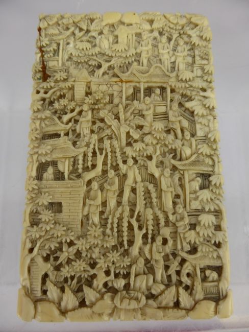 A 19th Century Chinese Carved Card Case, depicting various characters amongst pagoda landscape, finely carved, approx 11 x 6.5 cms