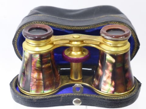 A Pair of Gilt Brass and Mother of Pearl Opera Glasses, L'Ingr Tissot Opticians, 33 Avenue de 'l Opera Paris, blue silk lined. (2)