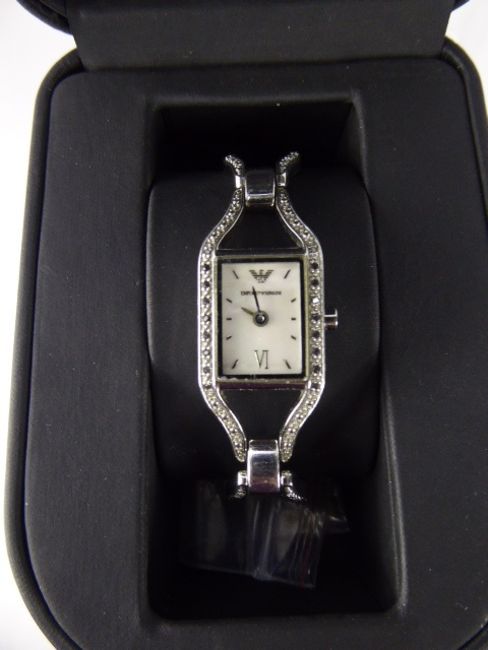 A Lady's Emporium Armani Stainless Steel Cocktail Watch, the watch having a mother of pearl face with black marcasite set bracelet in the original box with additional links, together with instruction manual and warranty.
